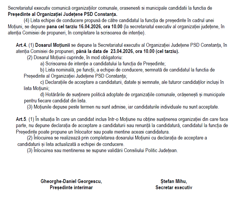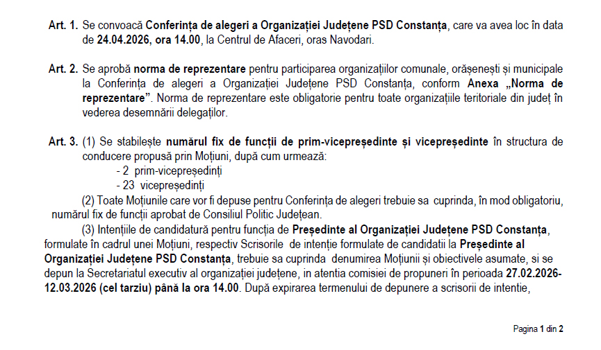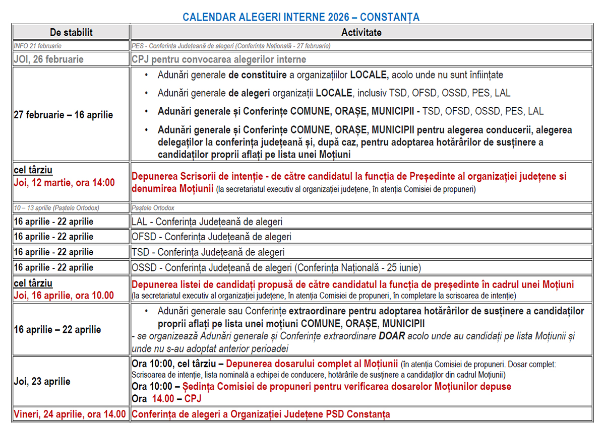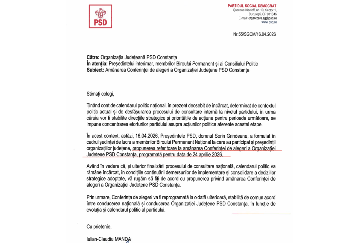 În contextul aglomerării calendarului politic la nivel național, o situație cunoscută public și care implică în mod direct Partidul Social Democrat, organizația PSD Constanța și reprezentanții acesteia, a fost solicitată amânarea datei Conferinței de Alegeri a Organizației Județene PSD Constanța, programată inițial pentru data de 24 aprilie 2026, pentru o dată ulterioară, care va fi stabilită în funcție de programul conducerii centrale a partidului.