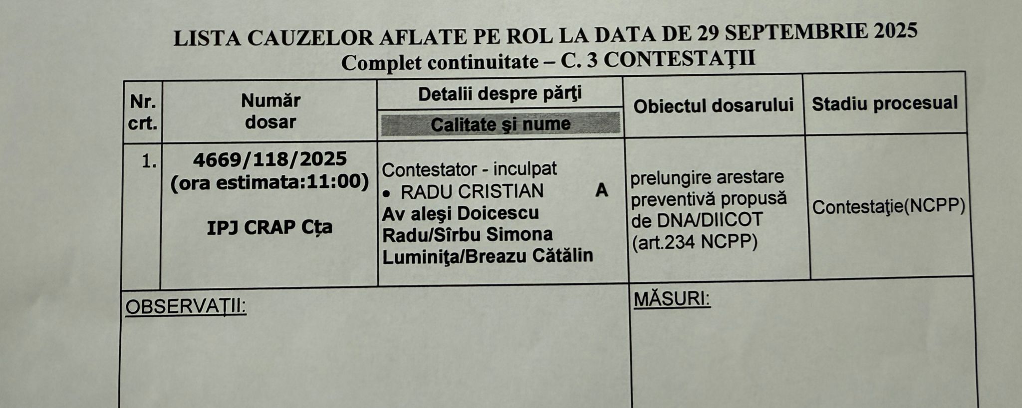 „Admite propunerea Parchetului de pe lângă Înalta Curte de Casație și Justiție, DNA, Serviciul Teritorial Constanța, de prelungire a măsurii arestării preventive a inculpatului RADU CRISTIAN.